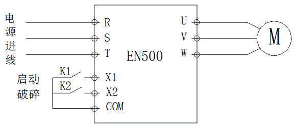 選擇EN500-4T450G/P變頻器,破碎石料運行50HZ,空載運行30HZ;運料車工程車卸貨處安裝位置檢測開關(guān),運料車到位輸出信號給變頻器,變頻器加速到50HZ,運料車離開經(jīng)過1.5分鐘結(jié)束破碎,變頻器減速到30HZ運行,周而復(fù)始。設(shè)置兩段加減速時間:第一段加速從0HZ到30HZ,設(shè)置加速30秒;第二段30HZ到50HZ加速20秒,從50HZ到30HZ,減速時間40秒。
