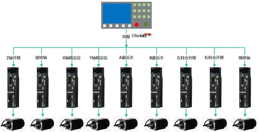 EtherCAT組網(wǎng)通訊,各個伺服在不同的工位分別控制升降、旋轉(zhuǎn)、搬運(yùn)等工作,實現(xiàn)高速高精密生產(chǎn)。現(xiàn)場圖片及流程示意圖如下。